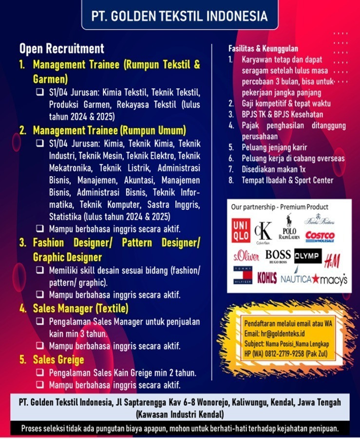PT Golden Tekstil Indonesia - Management Trainee, Designer, Sales Manager, Sales Greige
