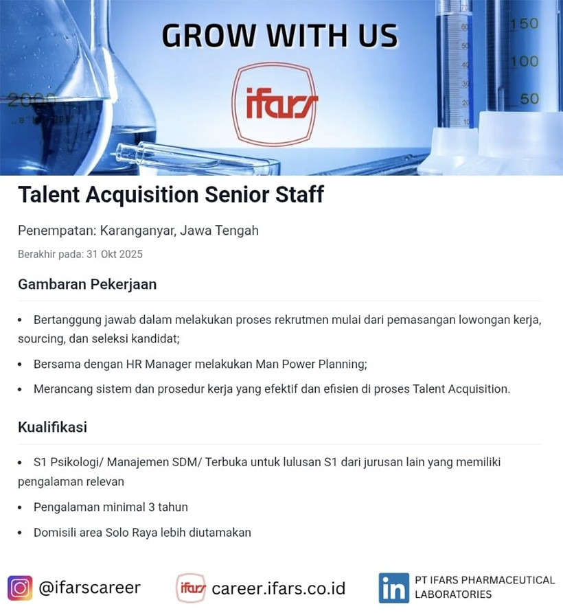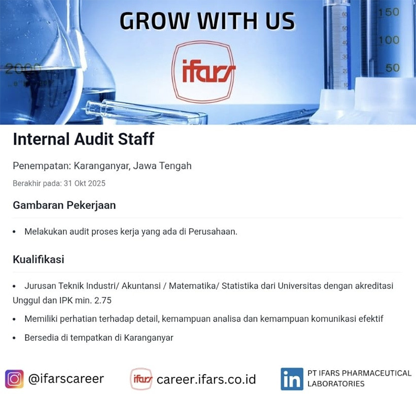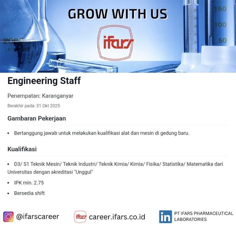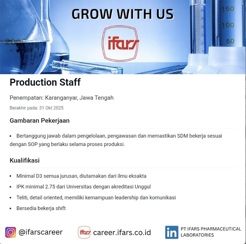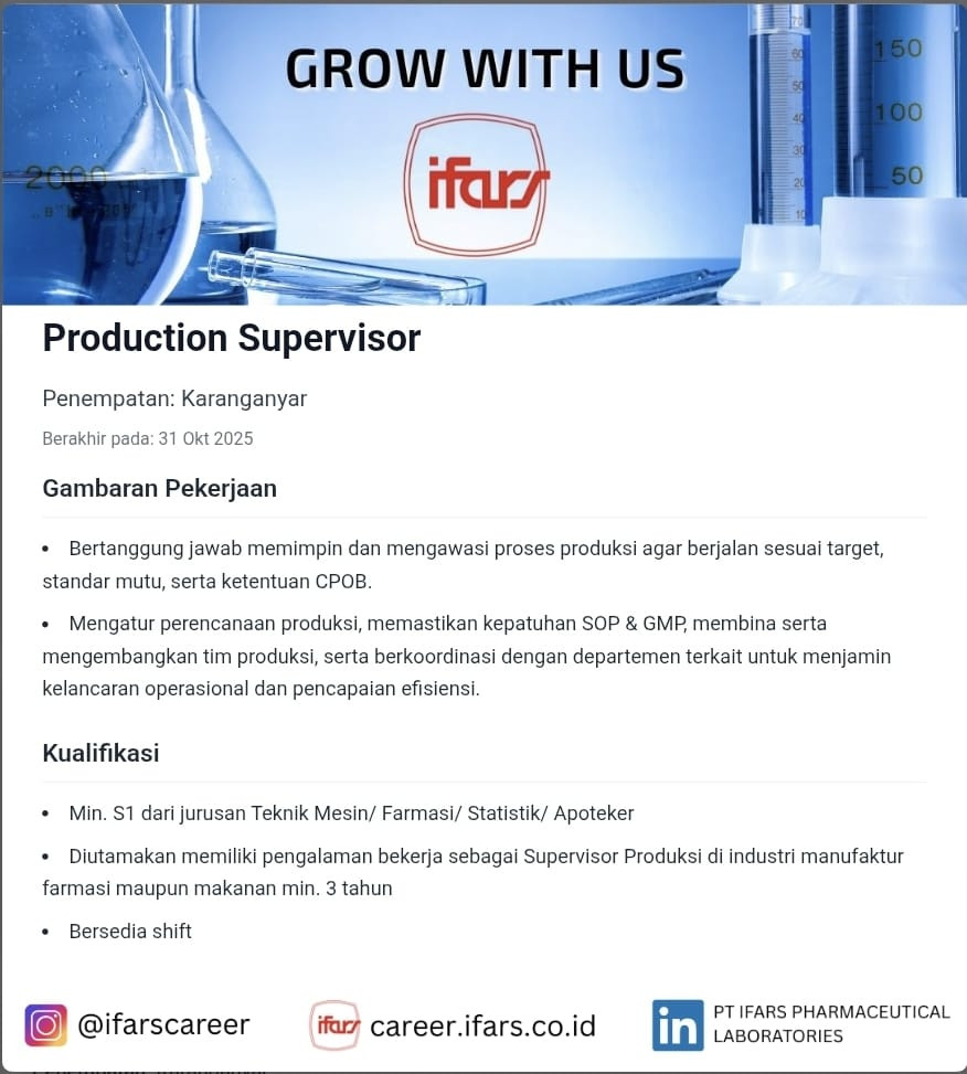 PT IFARS PHARMACEUTICAL LABORATORIES - Engineering Staff, Internal Audit Staff, Production Staff, Production Supervisor, Talent Acquisition Staff